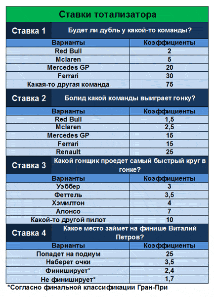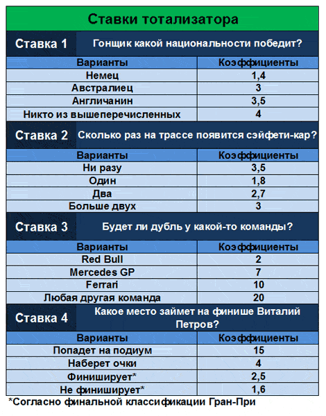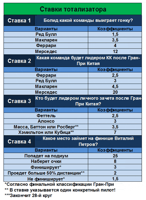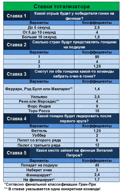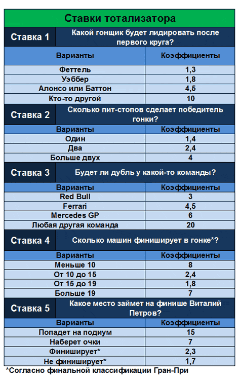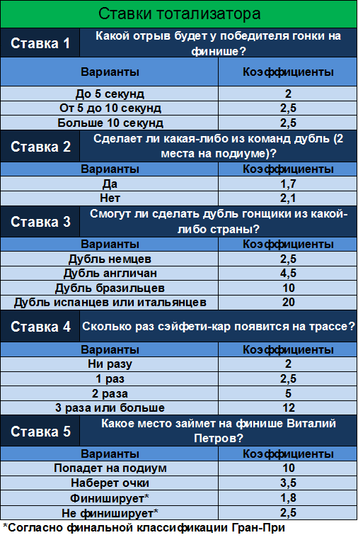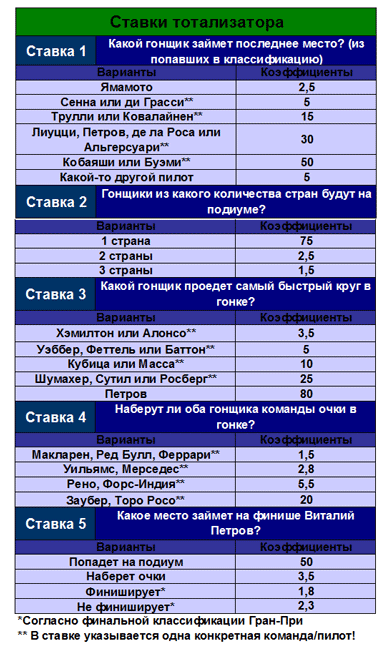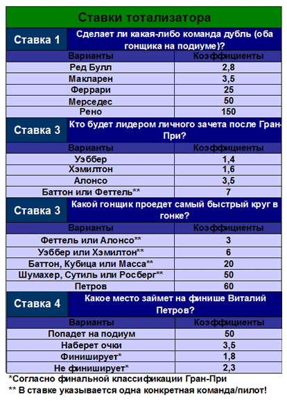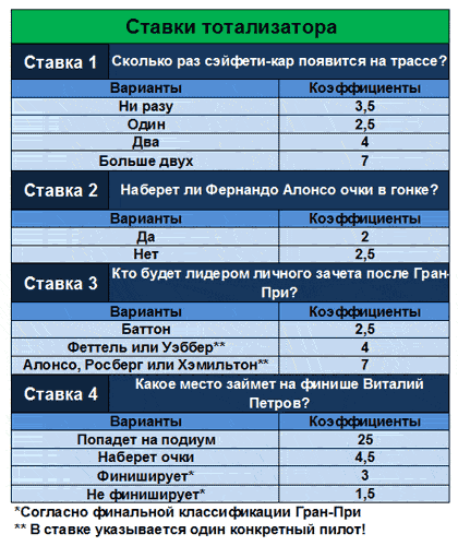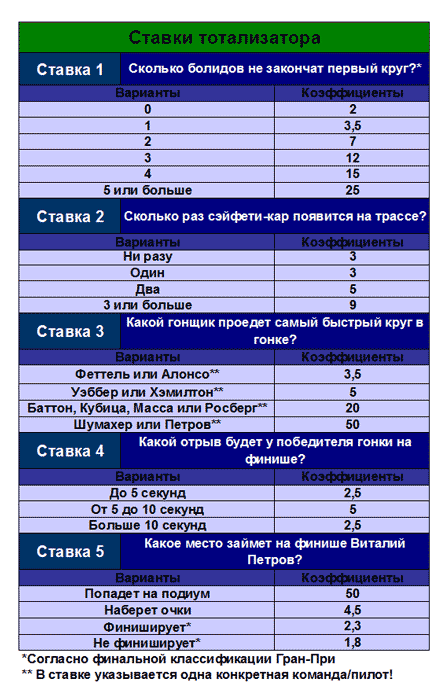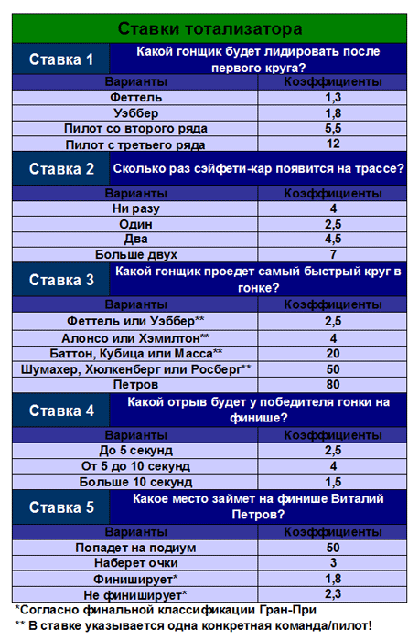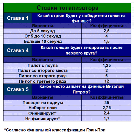 Ограничить время доступности (абсолютное время): c 11.03.2010 21:00:00 по 10.10.2010 12:55:00 Задание Какой гонщик будет лидировать после первого круга? Форма ответа: Вариант ставки - сколько ставите. Бонус №2 "Ставка №2. Сколько раз сэйфети-кар появится на трассе?" для всех Ограничить время доступности (абсолютное время): c 11.03.2010 21:00:00 по 10.10.2010 12:55:00 Задание Сколько раз сэйфети-кар появится на трассе? Форма ответа: Вариант ставки - сколько ставите. Бонус №3 "Ставка №3. Какой гонщик проедет самый быстрый круг в гонке?" для всех Ограничить время доступности (абсолютное время): c 11.03.2010 21:00:00 по 10.10.2010 12:55:00 Задание Какой гонщик проедет самый быстрый круг в гонке? Форма ответа: Вариант ставки - сколько ставите. Бонус №4 "Ставка №4. Какой отрыв будет у победителя гонки на финише?" для всех Ограничить время доступности (абсолютное время): c 11.03.2010 21:00:00 по 10.10.2010 12:55:00 Задание Какой отрыв будет у победителя гонки на финише? Форма ответа: Вариант ставки - сколько ставите. Бонус №5 "Ставка №5. Какое место займет на финише Виталий Петров?" для всех Ограничить время доступности (абсолютное время): c 11.03.2010 21:00:00 по 10.10.2010 12:55:00 Задание Форма ответа: Вариант ставки - сколько ставите. Какое место займет на финише Виталий Петров?