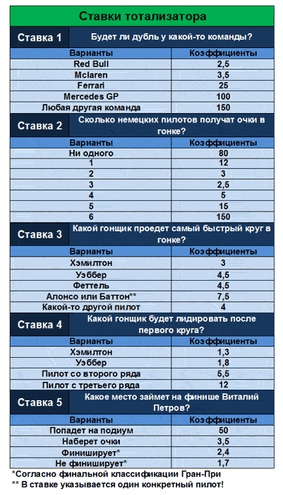Вы находитесь на третьем задании пятого этапа чемпионата. Здесь вы можете делать ставки на события в гонке, используя заработанные вами турнирные очки. Учтите, что если проиграете - очки, разумеется, сгорают. Ставок можно делать любое количество. С этого этапа вступают в силу новые правила тотализатора. Максимальная сумма ставок от одной команды ограничена суммой очков, заработанных на МШ текущего этапа, помноженной на два. Таким образом, максимальная ставка составит 200 очков (если ваша команда взяла на МШ все вопросы). Чтобы не лишать возможности сделать ставки команды, которые не участвовали в МШ (или не решили ни одного задания), для них устанавливается потолок ставок в 20 очков. Также напоминаем, что завтра вы можете взять дополнительный фотобонус. Для этого вам нужно найти человека, который сфотографируется на автодроме во время ГП, держа в руках лист бумаги (или что-то подобное) с названием вашей команды и именами двух гонщиков, которые заняли в квалификации первые два места (Уэббер и Росберг). На заднем плане должна быть видна трасса автодрома, а на ней - как минимум 1 болид. Фотографии нужно отсылать на почтовый ящик vitvol@yandex.ru, указав название команды в теме письма. Крайний срок отправки - 72 часа после окончания Гран-При. Статистика по фотобонусам учитывается вне основного зачета - команда, набравшая по итогам максимальное количество фотографий с гонок получит в конце сезона отдельный приз и игровые очки. ![]() Ставки вводить в соответствующие бонусные поля. Можно делать несколько ставок на один бонус, принимаются все. Если хотите отменить ставку, вводите в ответ "ОТМЕНА: текст ставки (вариант + сумма)" или "ОТМЕНА: все ставки". Во втором случае отменяются все ранее сделанные ставки в этом бонусе. Прием ставок прекращается за час до старта гонки, в 15:00 МСК 9 мая. Для перехода на уровень со статистикой введите код: "ПОСТАВИЛ ВСЕ".